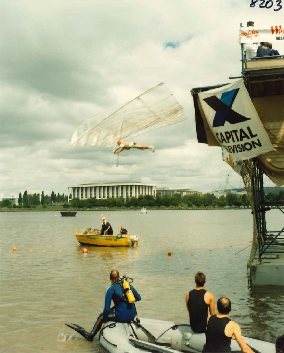 Another rite of passage for many Canberrans who were prepared to take a risk was the Birdman Rally, staged at Regatta Point every March.