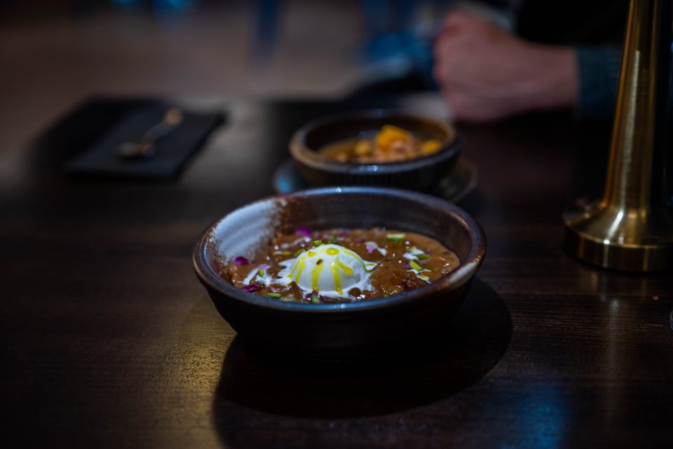 Mangalorian lamb ghee roast features rich, earthy spices such as fenugreek, cumin, and coriander seeds, which enhance the deep, meaty flavours. The meat is fork-tender; the goat’s cheese and the ghee it is cooked in wrap it in big, buttery mouthfuls. The eggplant kasundi is a much-needed balance; it just slaps you right in the face. I am sure the eggplant contains wasabi, but it doesn’t, as I learned that kasundi is fermented mustard.